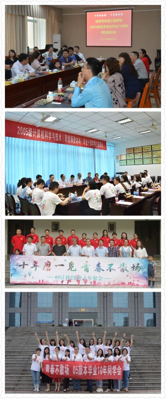 五一期间,beat365官网05级计算机科学与技术(职教)1班、计算机科学与技术2班,05级化学专业,05级旅游管理专业共150余名校友回到母校举行毕业十周年聚会。学校校友办负责人、相关学院领导、原任课老师和时任辅导员热情接待返校校友。师生共忆当年美好,畅叙同窗情谊。