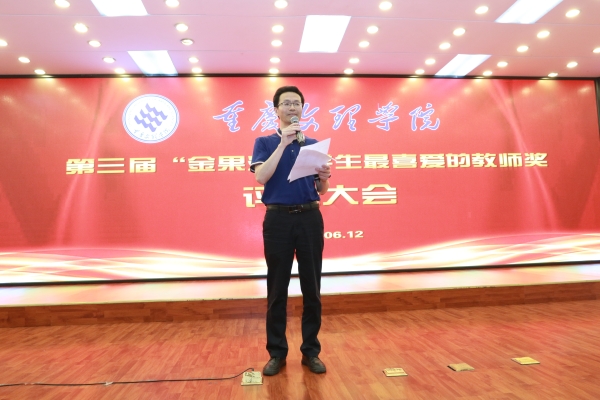 6月12日下午,beat365官网第三届“金果源”学生最喜爱的教师奖评选会在恪勤楼304报告厅举行。中国果品流通协会副会长、重庆金果源进出口公司总经理、中文82级校友艾中华,重庆金果源进出口公司董事长、生物86级校友黄治刚,重庆金果源进出口公司首席品牌官、中文89级校友聂荣,中国金果源进出口(泰国)公司总经理黄天全,学校党委书记孙泽平,副校长万书辉,教工部、党群部、资产部、教学部、学工部、校友办相关负责人,以及第二届“金果源”学生最喜爱的教师奖获得者,来自17个二级学院的170名学生评委参加了本次活动。