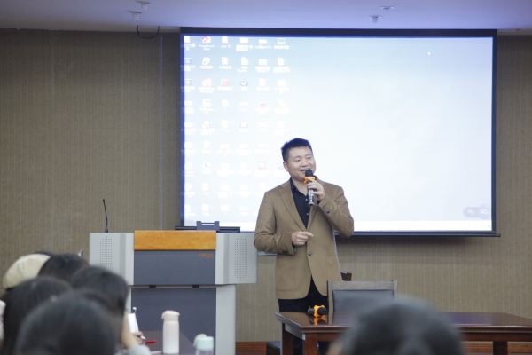 讲座伊始,孙晓晖老师就“如何上好一堂对学生有益的班会课”展开分享。她提出修身班会课的概念,解析其为两部分:担当法与故事法。担当法即担当总结,教师评价;故事法即故事讲述,教师引领。孙老师强调采用担当法能让学生通过班会课学习自我管理,实现良好习惯的自我养成。而故事法则为教师通过形象生动的事例讲述,让学生深入故事其中,从而正确引导学生。此外,孙晓晖老师幽默风趣、绘声绘色的授课方式也让现场气氛持续活跃,在场学子纷纷鼓掌,不断记录。