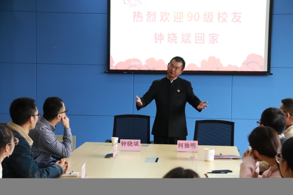 在数学与大数据学院,数学90级钟晓斌校友与师弟师妹开展座谈交流。钟晓斌校友回顾大学时期的学习生活,深情讲述了自己的成长经历。他认为同学们在校期间首要的应该找到适合自身的学习方法,学会思考,要大胆展示自己;他强调在校时期担任学生干部需要有勇气,更要有担当和作为,要做表率、当榜样。