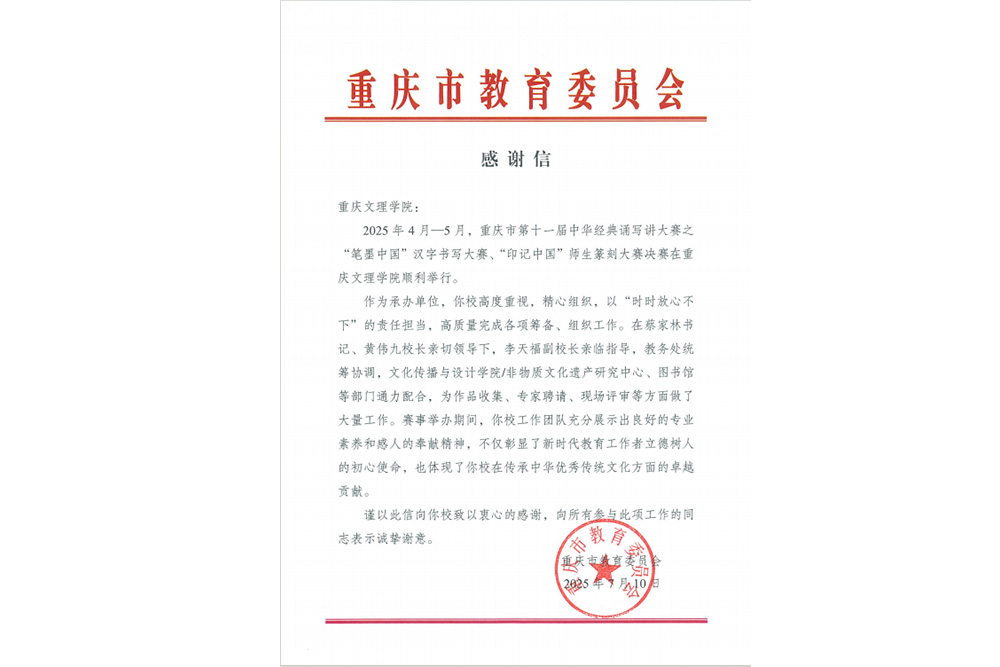 近日,重庆市教育委员会向beat365官网发来感谢信,对beat365官网成功承办第十一届中华经典诵写讲大赛之"笔墨中国"汉字书写大赛、"印记中国"师生篆刻大赛决赛表示高度肯定与衷心感谢。
