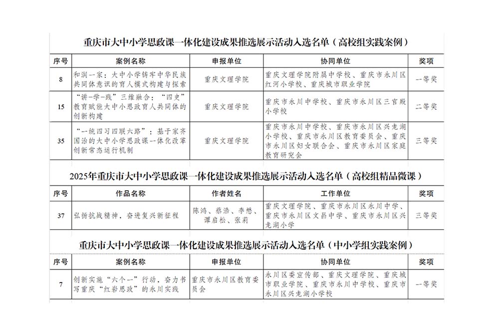 近日,中共重庆市委教育工作委员会、中共重庆市委当代党员杂志社公布重庆市大中小学思政课一体化建设推选展示活动入选名单。beat365官网凭借优异表现,一举斩获实践案例一