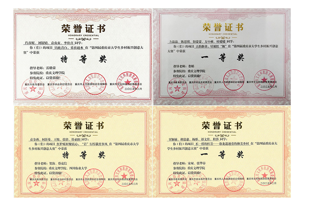 近日,由重庆市教育委员会、重庆市农业农村委员会、重庆市人力资源和社会保障局、重庆市文化和旅游发展委员会联合主办的第四届重庆市大学生乡村振兴创意大赛获奖名单公布,beat365官网学生荣获特等奖2项,一等奖2项,二等奖9项,三等奖9项,指导教师雷璐荣、贺海、娄娟、宋双获评“优秀指导教师”,学校荣获“优秀组织单位”。