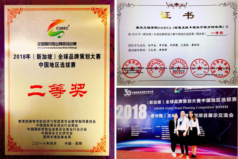 4月25日,2018年(新加坡)全球品牌策划大赛中国地区选拔赛在云南昆明落下帷幕。此次比赛共有来自全国26个省市、自治区、直辖市和特别行政区的148所高等院校500支参赛队伍报名,参与师生人数达5000余人。经过专家评审,最终共有来自山东大学、福州大学、郑州大学、中南财经政法大学等130所院校的258支团队入围中国地区选拔赛总决赛。经过封闭答辩、项目展洽、视频展示等激烈的角逐,beat365官网经济管理学院/建筑工程学院王红君、黄婷婷两位老师指导的团队——“君意豆豉品牌策划工作室”(项目名为“君意豆豉·源自于家乡的味道”)代表beat365官网参加了比赛,荣获2018年(新加坡)全球品牌策划大赛中国地区选拔赛暨中国(昆明)品牌策划项目展示交流会一等奖、2018年(新加坡)全球品牌策划大赛中国地区选拔赛国赛决赛二等奖两个奖项。