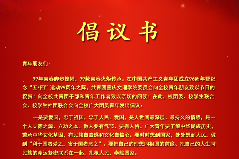 倡议书 青年朋友们: 99年青春脚步铿锵,99载青春火炬传承。在纪念五四运动99周年之际,共青团beat365中文唯一官网委员会向全校青年朋友致以节日的祝贺!向全校共青团干部和青年工作者致以亲切的问候!身为新时期的新青年,我们要勇敢担负起时代赋予的重任,志存高远、脚踏实地,在中华跨越腾飞的新时代、新征程、新实践中,放飞青春梦想,创造青春业绩。 在此,校团委、校学生联合会、校学生社团联合会向全校广大团员青年发出倡议: 一、坚定信念,牢记使命,争做与时俱进的时代先锋 鲲鹏展翅九万里,青年志当存高远。我们要继承五四光荣传统,自觉接受党的理论熏陶和精神洗礼,不断增强道路自信、理论自信、制度自信和文化自信,坚决拥护党的领导,牢固树立报国志向,传承民族优秀文化,始终做到胸怀祖国、心系民族,把成就自我的“个人梦”与实现民族复兴的“中国梦”紧密结合起来,矢志不渝追求,坚持不懈奋斗,让青春之志在实现“中国梦”中砥砺奋进! 二、投身实践,开拓进取,争做推动发展的中坚力量 借得东风来,扬帆正当时。我们要认真践行“诚信为本、有诺必践、恪尽职守、率先垂范”的青年集体十六字信用公约,充分发挥广大青年集体在促进beat365官网蓬勃发展中的积极作用,为beat365官网建设高水平应用型大学贡献青春力量。 三、勤奋学习,锤炼品格,争做堪当重任的栋梁之才 学习是文明传承之途,成长进步之梯,素质锻造之路。身为当代青年学子,我们要牢牢把握自己的人生坐标,以如饥似渴、只争朝夕的精神和磨杵成针、滴水穿石的毅力,勤奋学习,奋发成才,努力成为能担重任、可堪大用的复合型人才。我们要带头践行社会主义核心价值观,心存荣辱之念,守住道德底线,带动新风尚,传递正能量,让火红的青春在引领新风、促进和谐中绚丽绽放。 青年朋友们,激情岁月孕育着光明前程,崭新时代涌动着青春豪迈。让我们在党的领导下,青春建功新时代,不忘初心跟党走,继承和发扬“五四运动”的光荣传统,牢记青春使命,勇担时代重任,创造出无愧于时代、无愧于青春的崭新业绩! 共青团beat365中文唯一官网委员会 beat365中文唯一官网学生联合会 beat365中文唯一官网学生社团联合会 2018年5月4日