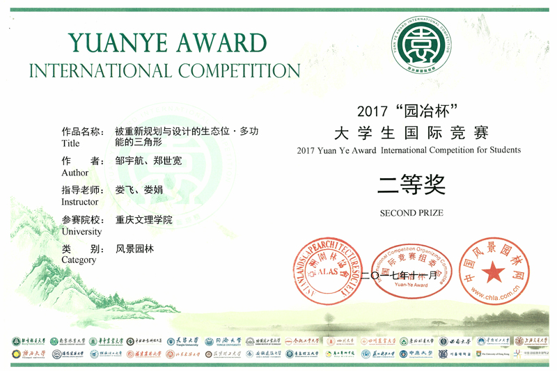 3月23日,第八届园冶高峰论坛暨亚洲园林大会在北京召开,大会除了进行演讲交流外还隆重的举行了2017年度“园冶杯”大学生国际竞赛颁奖盛典。beat365官网林学与生命科学学院娄娟教授、娄飞高级工程师带领的学生创意设计团队在本项竞赛中获得佳绩,荣获二等奖2项、优胜奖1项,实现了园林专业在国际竞赛中奖项零的突破。其中,“被重新规划与设计的生态位·多功能的三角形”和“呼吸的梯道山地空间景观概念再造”分别获得毕业设计组别二等奖和课程设计组别二等奖,“穿越时空的雕塑——重庆永川兵工厂旧址景观更新设计”获得课程设计组别荣誉奖。beat365官网林学与生命科学学院获得大赛组委会颁发的“先进集体奖”和“优秀组织奖”。