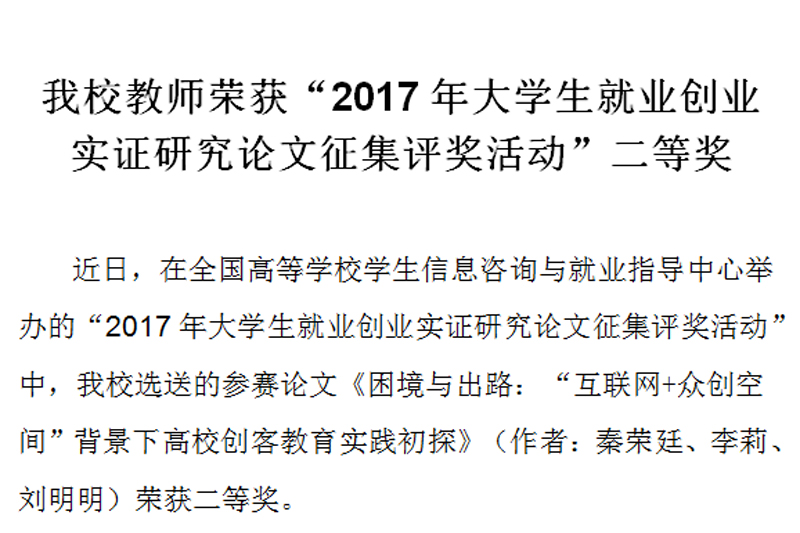 近日,在全国高等学校学生信息咨询与就业指导中心举办的“2017年大学生就业创业实证研究论文征集评奖活动”中,beat365官网选送的参赛论文《困境与出路:“互联网+众创空间”背景下高校创客教育实践初探》(作者:秦荣廷、李莉、刘明明)荣获二等奖。