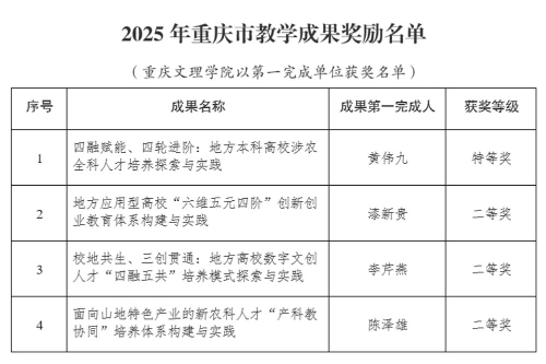 近日,重庆市人民政府印发了《关于2025年重庆市教学成果奖励的决定》(渝府发〔2025〕17号)。全市各级各类学校共计420项教学成果获得奖励。