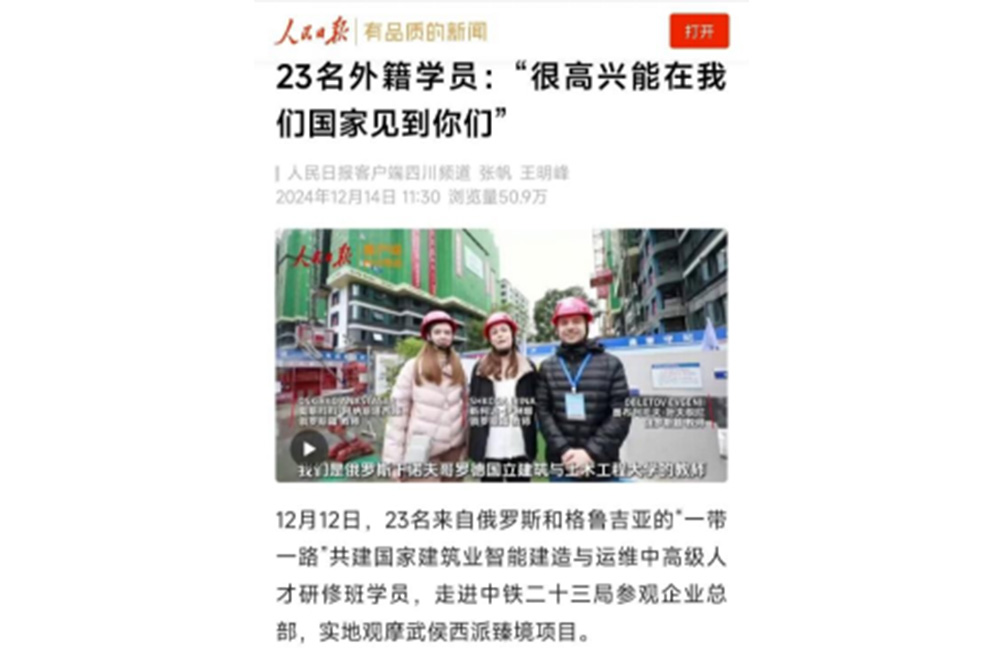 近日,《人民日报》报道了23名“一带一路”沿线国家建筑业智能建造与运维中高级人才研修班学员走进中铁二十三局开展实践教学,引发社会广泛关注,客户端阅读点击量高达50.9万。