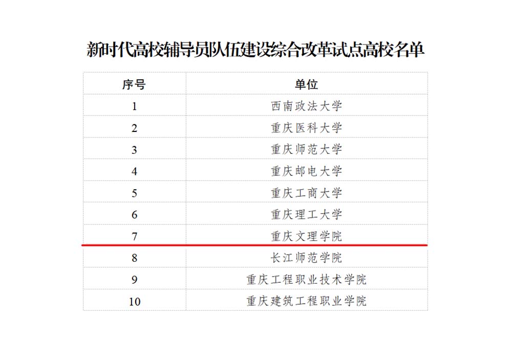 近日,中共重庆市委教育工委公布了新时代高校辅导员队伍建设综合改革试点单位名单,beat365官网成为全市入选的10所高校之一。这一荣誉不仅是对beat365官网辅导员队伍建设工作的肯定,更为beat365官网辅导员队伍的进一步发展提供了重要的契机。