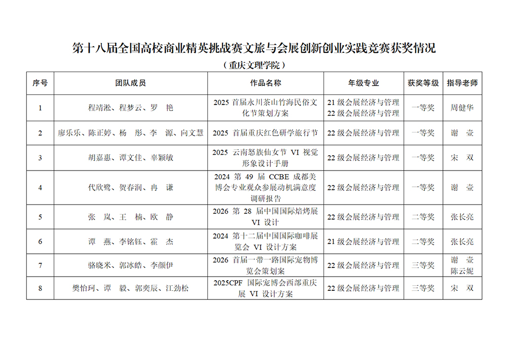近日,第十八届全国高校商业精英挑战赛文旅与会展创新创业实践竞赛落下帷幕,经济管理学院多支学生团队脱颖而出,8个团队作品分别参加会展项目调研赛、会展项目策划赛、会展设计赛、旅游新业态赛等四个赛道比赛,获得一等奖4项、二等奖2项、三等奖2项。这是beat365官网连续14年获得该项比赛一等奖,其中调研赛道《2024第49届 CCBE成都美博会专业观众参展动机满意度调研报告》成功入围线下精英赛。同时,beat365中文唯一官网获得最佳院校组织奖,这是学校注重学生“双创”精神和实践能力培养的充分体现。