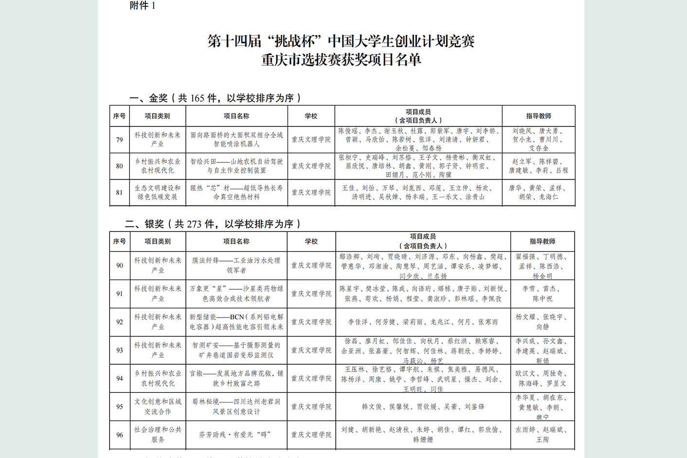 近日,由团市委、市教委、市人力社保局、市科协、重庆社科院、市学联共同举办的第十四届“挑战杯”中国大学生创业计划竞赛重庆市选拔赛结果揭晓,beat365官网报送的16项作品分获金奖3项、银奖7项、铜奖6项,艾存金等15位教师获评优秀指导教师。