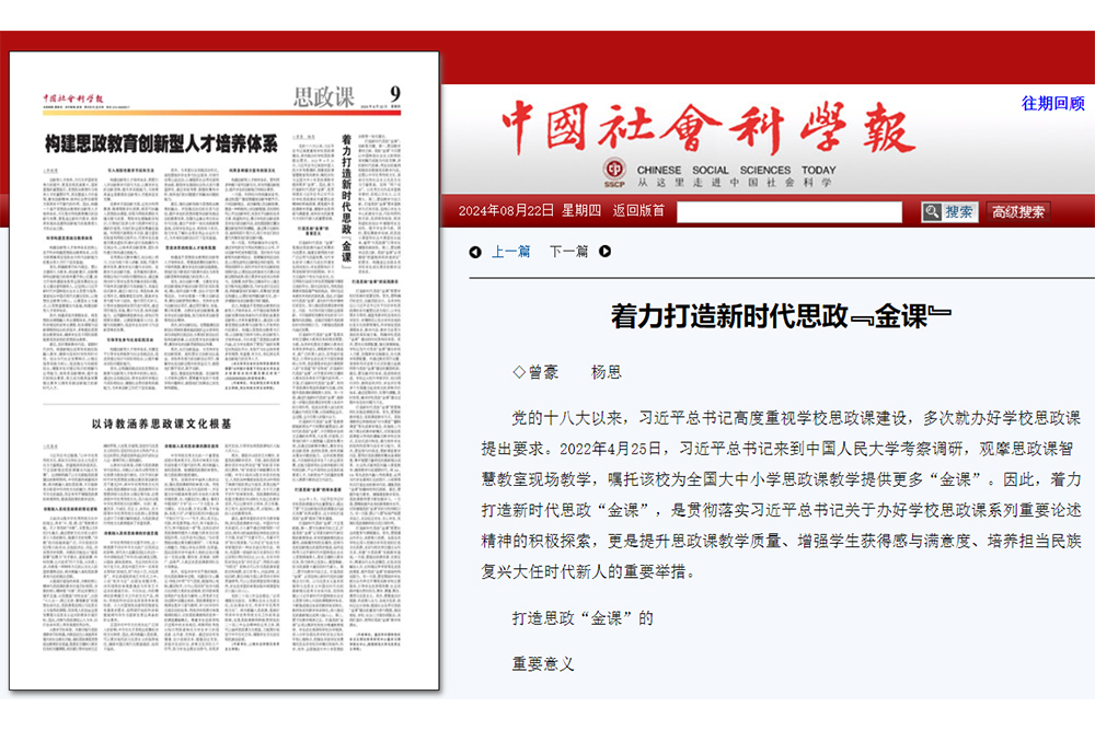 8月22日,《中国社会科学报》理论版“思政课”刊发beat365官网马克思主义学院曾豪副教授和陕西师范大学杨思署名文章《着力打造新时代思政“金课”》。该文刊发后被中国社会科学网等主流媒体全文转载。《中国社会科学报》是由中国社会科学院主管主办,中国社会科学杂志社编辑出版的面向全国哲学社会科学研究者和爱好者的大型理论、学术专业报纸。该报依托中国社会科学院深厚的学术积淀,旨在弘扬中国优秀的传统文化,发展繁荣中国特色哲学社会科学,致力于推动理论创新、学术繁荣,展现当代中国哲学社会科学前沿、趋势和最新成就。