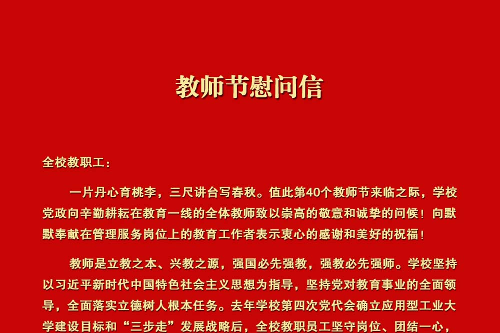 全校教职工: 一片丹心育桃李,三尺讲台写春秋。值此第40个教师节来临之际,学校党政向辛勤耕耘在教育一线的全体教师致以崇高的敬意和诚挚的问候!向默默奉献在管理服务岗位上的教育工作者表示衷心的感谢和美好的祝福! 教师是立教之本、兴教之源,强国必先强教,强教必先强师。学校坚持以习近平新时代中国特色社会主义思想为指导,坚持党对教育事业的全面领导,全面落实立德树人根本任务。去年学校第四次党代会确立应用型工业大学建设目标和“三步走”发展战略后,全校教职员工坚守岗位、团结一心,用智慧和爱心,在教育教学、学科科研、社会服务、文化传承等方面攻坚克难,这一年成绩斐然。学校获批重庆市普通本科高校产教融合特色优势专业群1个、“本科教学成果培育揭榜挂帅”专项项目2项,首次获得获教育部高等学校科学研究优秀成果奖二等奖。学校新增7个硕士学位授予点,新增4个省级科研平台,顺利通过武器装备科研生产单位二级保密资格认定。学生社区治理工作先后受到时任副市长商奎等各级领导表扬,治理成果在《重庆教育工作情况简报》刊发推广,受到“中国教育报”等主流媒体广泛报道,赢得社会高度评价;新生一本线上录取占51.5%,2024届毕业生初次去向落实率达89.7%。33人入选重庆市第四批学术技术带头人和后备人选,人才工作体制机制不断完善。市委书记袁家军到校调研,对学校的办学成绩给予肯定,要求立足永川、面向成渝、服务全国、融入全球,与时俱进优化学科设置,着力打造创新平台,加快引育高端人才。 站在新的起点上,我们斗志昂扬、我们责任更加重大。学校将深化教育综合改革,大力弘扬教育家精神,加强师资队伍建设,优化资源配置,构建高质量育人体制机制,努力培养更多让党放心、爱国奉献、担当民族复兴重任的时代新人。希望广大教职工,牢记为党育人、为国育才使命,坚定信心、奋发有为,真抓实干、开拓创新,在奋力谱写中国式现代化重庆篇章中作出更大贡献! 最后,祝愿全校教职工节日快乐,身体健康,工作顺利,阖家幸福! 中共beat365中文唯一官网委员会 beat365中文唯一官网 2024年9月10日