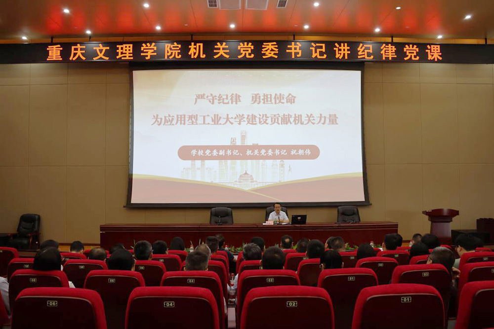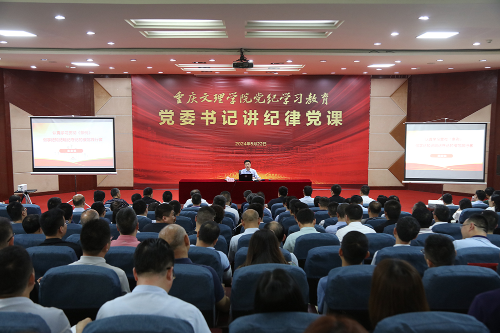 为深入学习贯彻习近平总书记视察重庆的重要讲话和重要指示精神,切实把思想和行动统一到习近平总书记对重庆寄予的厚望上来,扎实开展党纪学习教育,5月22日下午,党委书记蔡家林以《认真学习贯彻<条例>,做学纪知纪明纪守纪的模范践行者》为题,在博文馆101报告厅为全校中干、科岗人员讲授党纪学习教育专题党课。