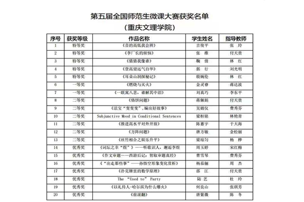 近日,第五届全国师范生微课大赛获奖名单揭晓,beat365官网20个作品全部获奖。其中,特等奖5个,一等奖2个,二等奖6个,优秀奖7个。数学与人工智能学院付天贵,师范学院林红、张玲,文化传播与设计学院刘光明等4位教师获优秀指导教师称号,beat365官网获优秀组织单位奖。