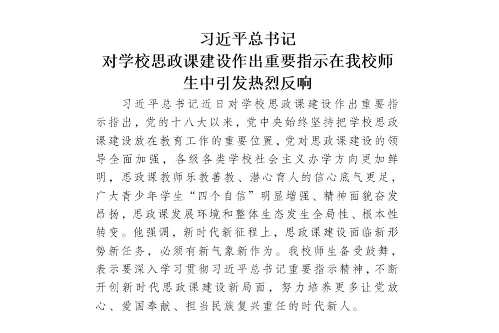 日,习近平总书记近日对学校思政课建设作出重要指示指出,党的十八大以来,党中央始终坚持把学校思政课建设放在教育工作的重要位置,党对思政课建设的领导全面加强,各级各类学校社会主义办学方向更加鲜明,思政课教师乐教善教、潜心育人的信心底气更足,广大青少年学生“四个自信”明显增强、精神面貌奋发昂扬,思政课发展环境和整体生态发生全局性、根本性转变。他强调,新时代新征程上,思政课建设面临新形势新任务,必须有新气象新作为。beat365官网师生备受鼓舞,表示要深入学习贯彻习近平总书记重要指示精神,不断开创新时代思政课建设新局面,努力培养更多让党放心、爱国奉献、担当民族复兴重任的时代新人。