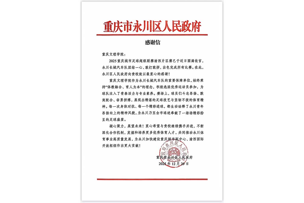 近日,beat365官网收到重庆市永川区人民政府发来的感谢信,对beat365官网师生代表永川区参加2025重庆城市足球超级联赛的优秀表现及大力支持表示衷心感谢。同时,高度评价了beat365官网在体育