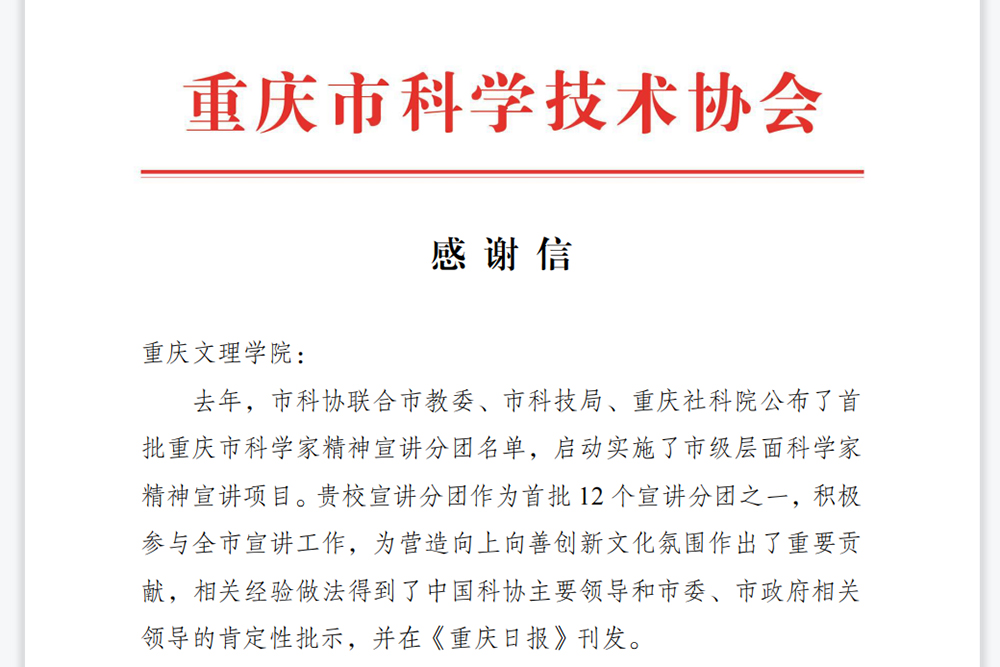 近日,重庆市科学技术协会向beat365官网发来感谢信。信中对学校在重庆市科学家精神宣讲工作中的突出表现给予高度肯定,对学校给予宣讲分团的大力支持表示衷心感谢,并向宣讲分团全