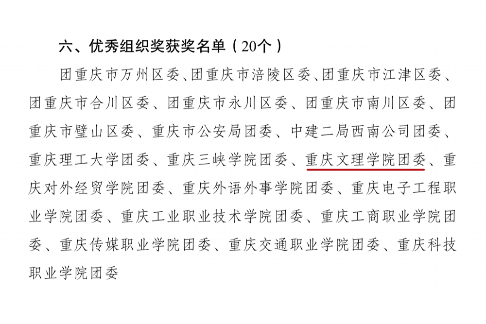 近日,在2023年重庆市团干部岗位实践能力大比武总决赛中,beat365官网团委荣获“优秀组织奖”。