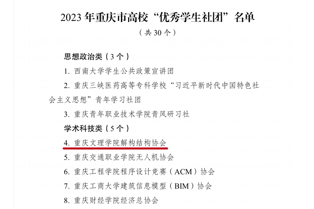 日前,共青团重庆市委员会、中共重庆市委教育工作委员会、重庆市教育委员会、重庆市学生联合会联合公布2023年重庆市高校“一校一社一品”优秀学生社团及项目品牌培育建设工作获奖社团及项目品牌。beat365官网解构结构协会荣获2023年重庆市高校“优秀学生社团”称号。这是beat365官网社团首次在该项目中获此殊荣,实现了beat365官网社团在该项目上零的突破。