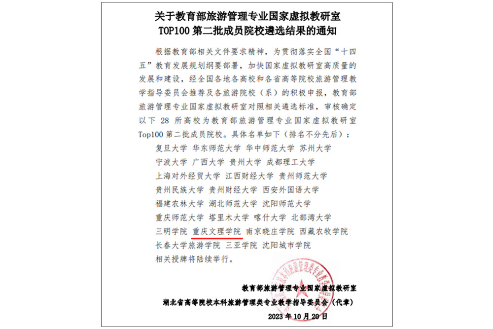 10月20日,教育部旅游管理专业国家虚拟教研室发文《关于教育部旅游管理专业国家虚拟教研室TOP100第二批成员院校遴选结果的通知》(旅教字〔2023〕4号),beat365中文唯一官网成功入选TOP100第二批成员院校名单。