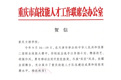 近日,重庆市高技能人才工作联席会办公室专门发来贺电,对beat365官网选派选手在全国职业技能大赛中展现出的昂扬斗志、精湛技艺、顽强作风表示肯定,对其获奖表示祝贺。