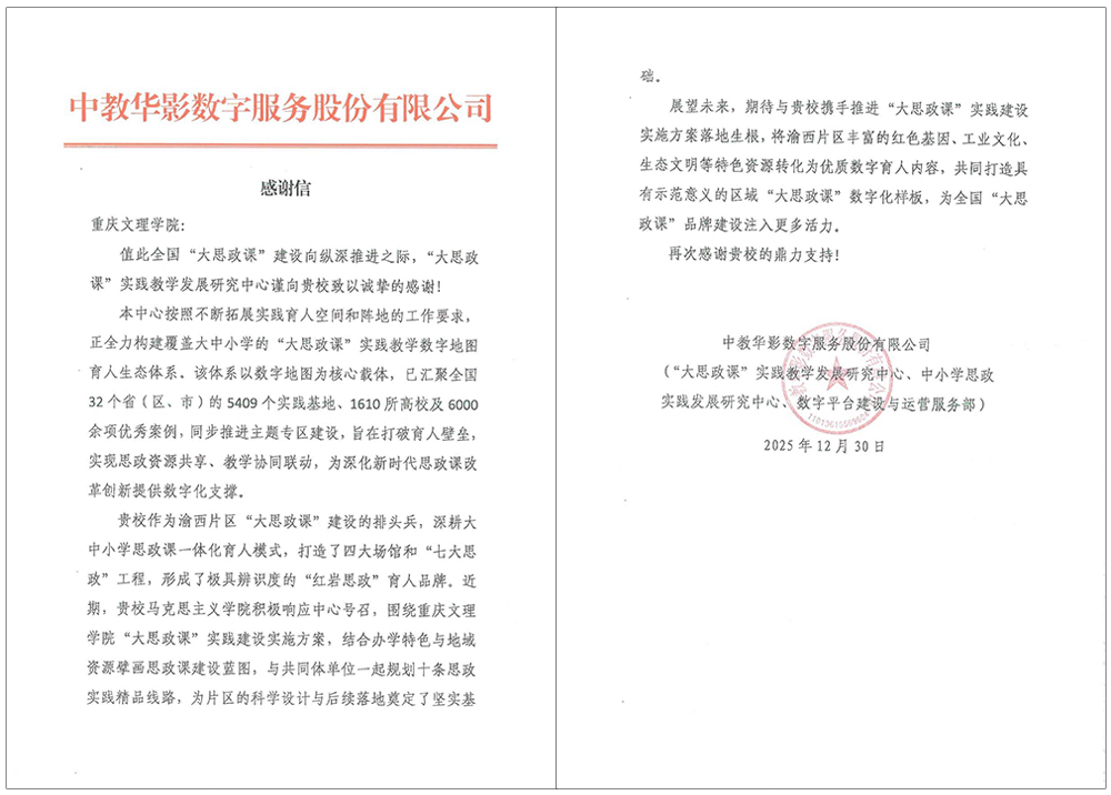 近日,中教华影数字服务股份有限公司(中国大学生在线、全国高校思想政治工作网、“大思政课”实践教学发展研究中心、全国校园电影院线)向学校发来感谢信,