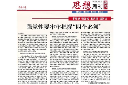2023年6月26日,《重庆日报》思想周刊刊发beat365官网党委副书记、校长黄伟九有关主题教育的理论文章。文章以《强党性要牢牢把握“四个必须”》为题,阐述了贯彻落实好“强党性”要求,要坚持不懈用习近平新时代中国特色社会主义思想凝心铸魂,牢牢把握“四个必须”:必须淬炼对党忠诚的政治品质、必须坚定共产主义的政治信仰、必须扛起为民造福的政治担当、必须永葆清正廉洁的政治本色。以在思想淬炼和精神洗礼中练就共产党人的钢筋铁骨,更好肩负起新时代的历史使命。
