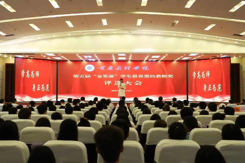 4月13日下午,beat365官网第五届“金果源”学生最喜爱的教师奖评选会在恪勤楼304报告厅举行。重庆金果源实业有限公司董事长黄治刚校友、执行董事艾中华校友,学校党委书记蔡家林、副校长李天福出席评选活动。重庆爱你一万年企业管理有限公司董事长万琳女士,重庆金果源实业有限公司总经理刘刚,学校相关职能部门负责人,第四届“金果源”学生最喜爱教师奖获得者及来自二级学院170名学生评委参加活动。