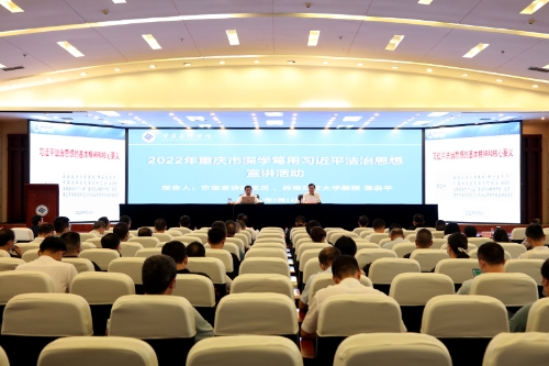 按照《中共重庆市委宣传部 重庆市司法局 重庆市普法工作办公室关于开展2022年度重庆市深学笃用习近平法治思想宣讲的通知》要求,9月14日下午,beat365官网举行了深学笃用习近平法治思想宣讲报告会,主会场设在恪勤楼304报告厅,分会场设在恪勤楼623会议室。全国普法办“八五”普法民法典讲师团成员、重庆市深学笃用习近平法治思想市级宣讲团成员、西南政法大学教授、博士生导师谭启平作宣讲报告。全体在家校领导、中层干部、思政课教师和法学专业教师参加了报告会。会议由党委常委、副校长李天福主持。