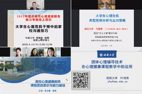 为进一步加强学校专兼职心理教师和辅导员队伍建设,学校分别于4月13日、20日、27日上午,组织各学院分管学生工作负责人、学工办主任、辅导员、专兼职心理教师参加重庆高校心理健康服务能力线上培训(第二期)。