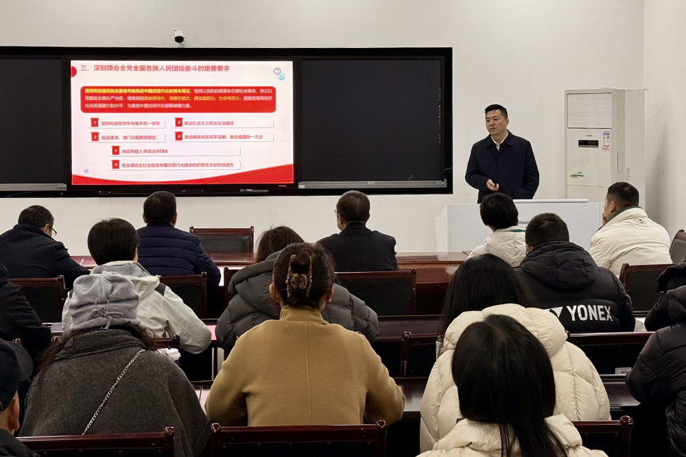 12月25日上午,学校党委常委、副校长金盛在格术楼B706宣讲党的二十届四中全会精神。