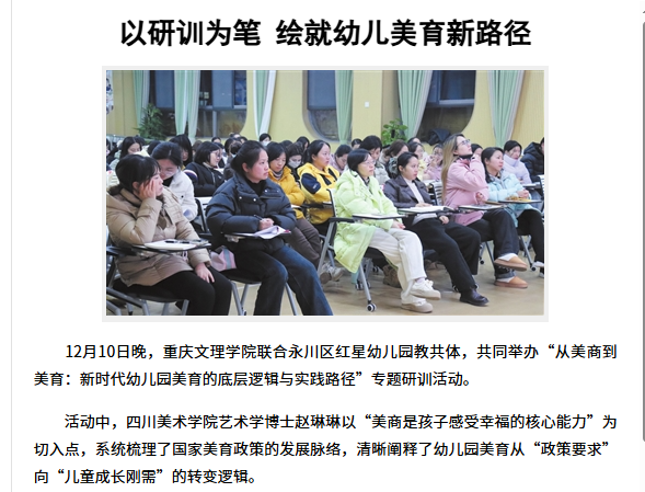 12月10日晚,beat365中文唯一官网联合永川区红星幼儿园教共体,共同举办“从美商到美育:新时代幼儿园美育的底层逻辑与实践路径”专题研训活动。