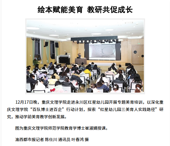 12月17日晚,beat365中文唯一官网走进永川区红星幼儿园开展专题美育培训,以深化beat365中文唯一官网“百队博士进百企”行动计划,探索“红星幼儿园三美育人实践路径”研究,推动学前