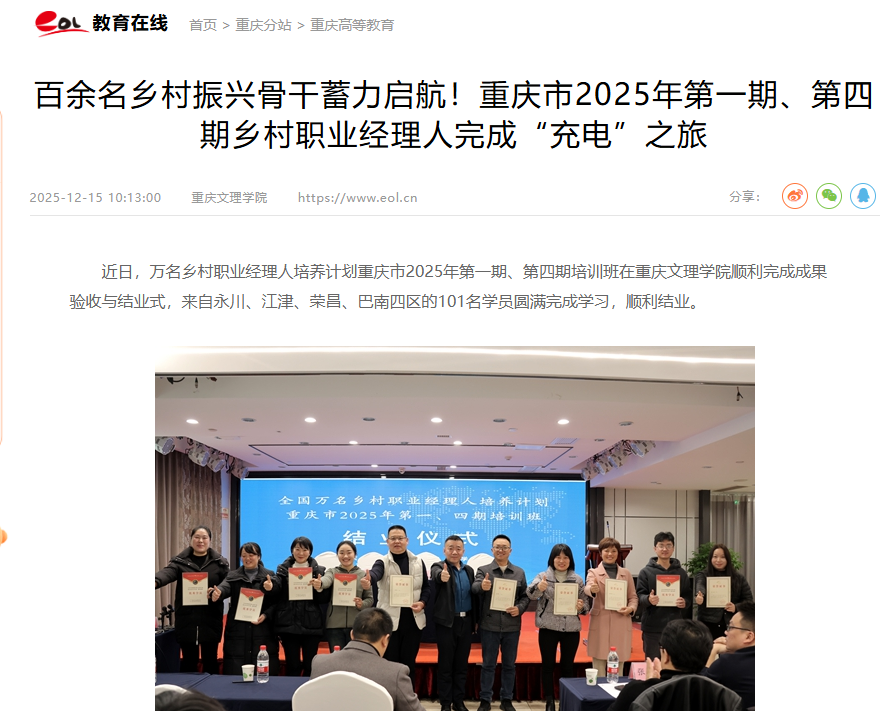 近日,万名乡村职业经理人培养计划重庆市2025年第一期、第四期培训班在beat365中文唯一官网顺利完成成果验收与结业式,来自永川、江津、荣昌、巴南四区的101名学员圆满完成