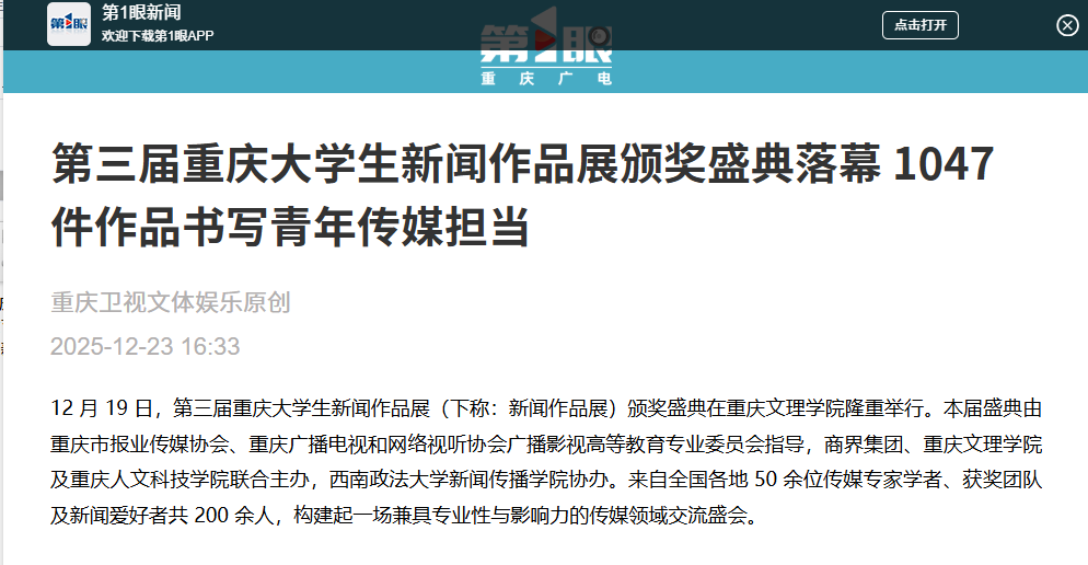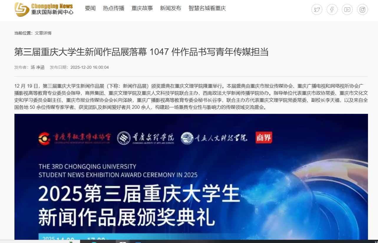 12 月 19 日,第三届重庆大学生新闻作品展(下称:新闻作品展)颁奖盛典在beat365中文唯一官网隆重举行。本届盛典由重庆市报业传媒协会、重庆广播电视和网络视听协会广播影