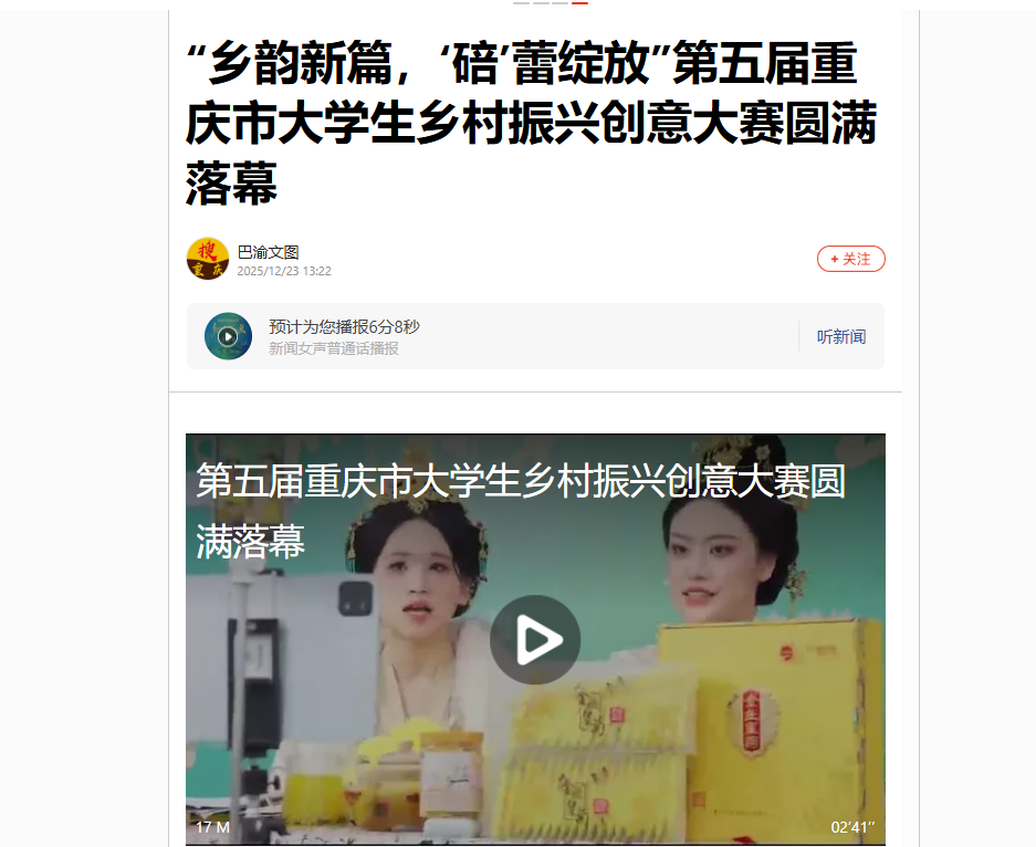 “汇聚高校人才与智力资源,为大学生乡村创新创业打造优质平台、营造优越环境、探索实践路径。”2025年12月21日,由重庆市教育委员会、重庆市农业农村委员会、重庆
