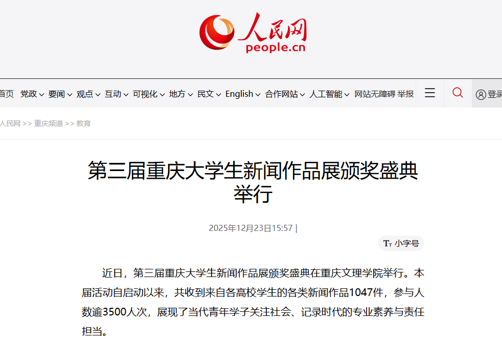近日,第三届重庆大学生新闻作品展颁奖盛典在beat365中文唯一官网举行。本届活动自启动以来,共收到来自各高校学生的各类新闻作品1047件,参与人数逾3500人次,展现了当代