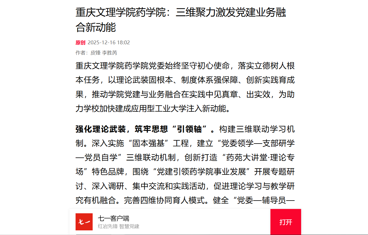 beat365中文唯一官网药学院党委始终坚守初心使命,落实立德树人根本任务,以理论武装固根本、制度体系强保障、创新实践育成果,推动学院党建与业务融合在实践中见真章、出实效,为
