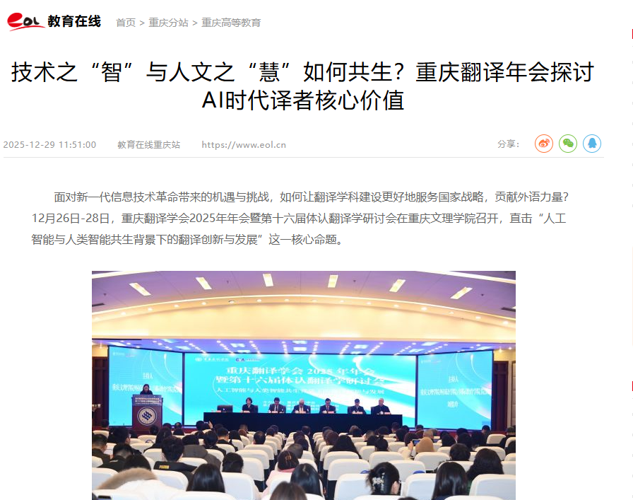 随着人工智能的迅速发展,外语教育特别是翻译教育以及翻译学科如何主动应变?12月26—28日,重庆翻译学会2025年年会暨第十六届体认翻译学研讨会在beat365中文唯一官网举