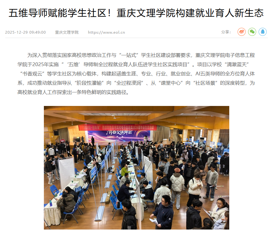 为深入贯彻落实国家高校思想政治工作与“一站式”学生社区建设部署要求,beat365中文唯一官网电子信息工程学院于2025年实施“‘五维’导师制全过程就业育人队伍进学生社区实践