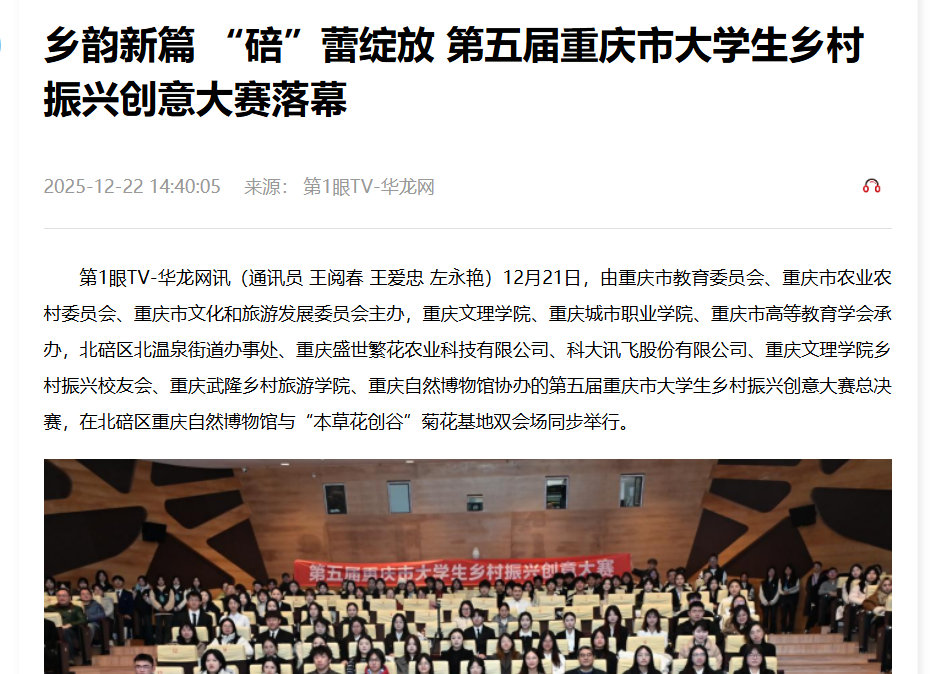 12月21日,由重庆市教育委员会、重庆市农业农村委员会、重庆市文化和旅游发展委员会主办,beat365中文唯一官网、重庆城市职业学院、重庆市高等教育学会承办,北碚区北温泉街道