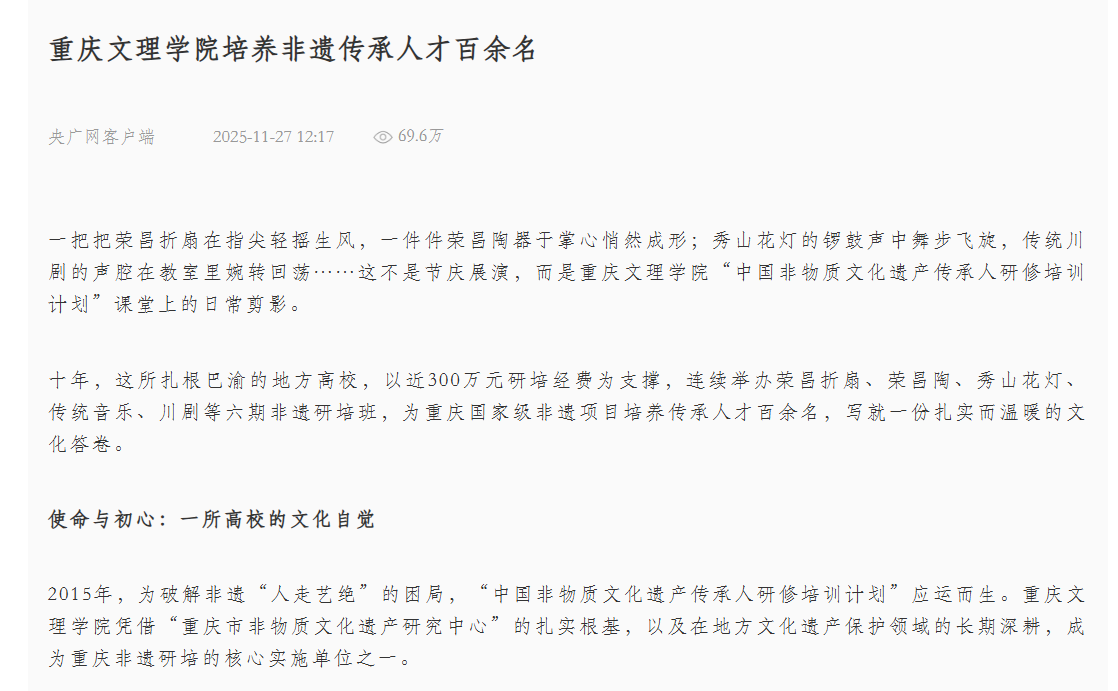 一把把荣昌折扇在指尖轻摇生风,一件件荣昌陶器于掌心悄然成形;秀山花灯的锣鼓声中舞步飞旋,传统川剧的声腔在教室里婉转回荡……这不是节庆展演,而是beat365中文唯一官网“中国