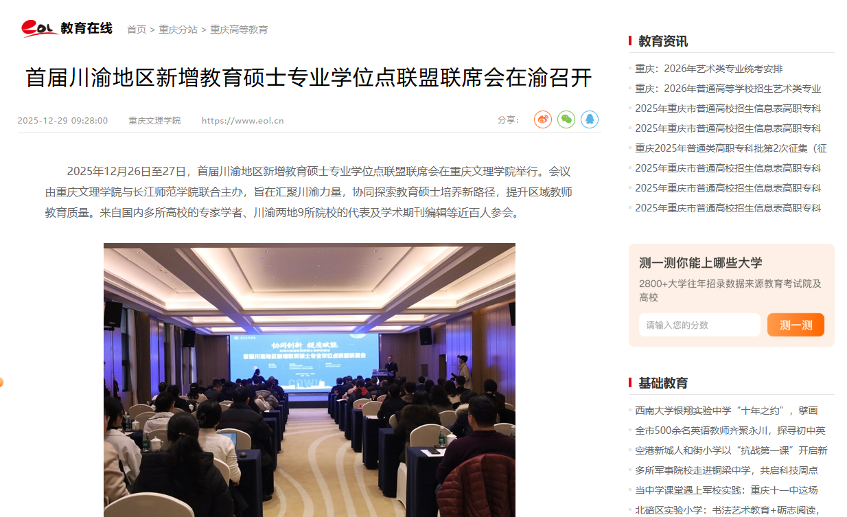 2025年12月26日至27日,首届川渝地区新增教育硕士专业学位点联盟联席会在beat365中文唯一官网举行。会议由beat365中文唯一官网与长江师范学院联合主办,旨在汇聚川渝力量,协同
