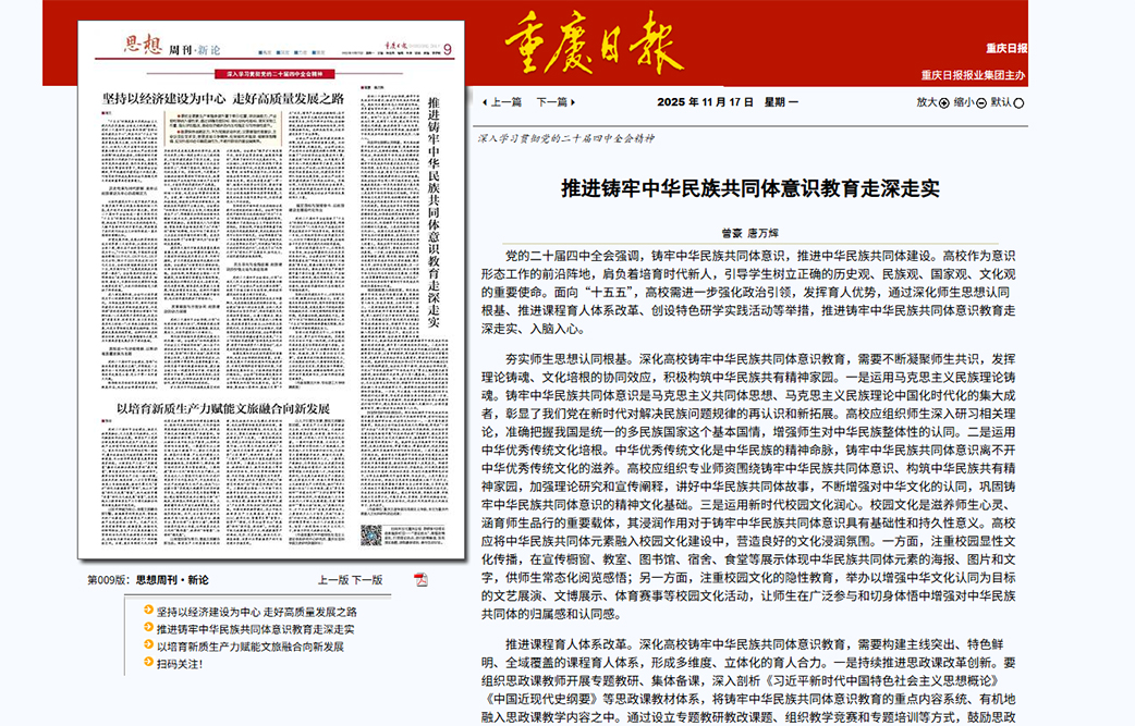 党的二十届四中全会强调,铸牢中华民族共同体意识,推进中华民族共同体建设。高校作为意识形态工作的前沿阵地,肩负着培育时代新人,引导学生树立正确的历史观、民族观、国