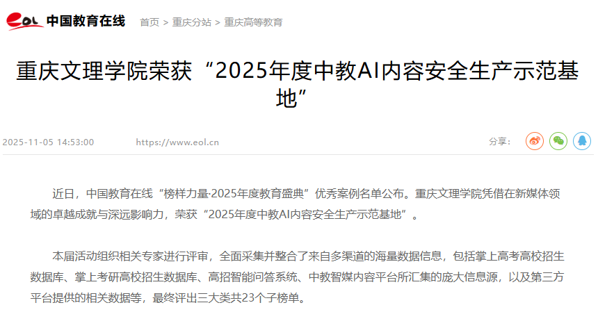 近日,中国教育在线“榜样力量·2025年度教育盛典”优秀案例名单公布。beat365中文唯一官网凭借在新媒体领域的卓越成就与深远影响力,荣获“2025年度中教AI内容安全生产