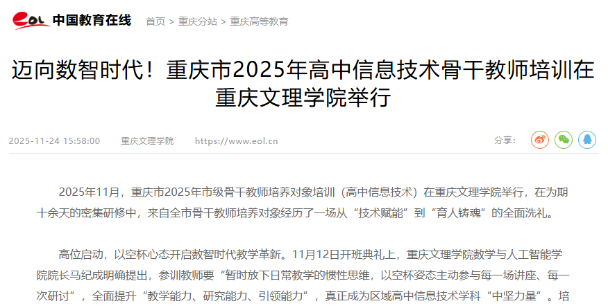 2025年11月,重庆市2025年市级骨干教师培养对象培训(高中信息技术)在beat365中文唯一官网举行,在为期十余天的密集研修中,来自全市骨干教师培养对象经历了一场从“技