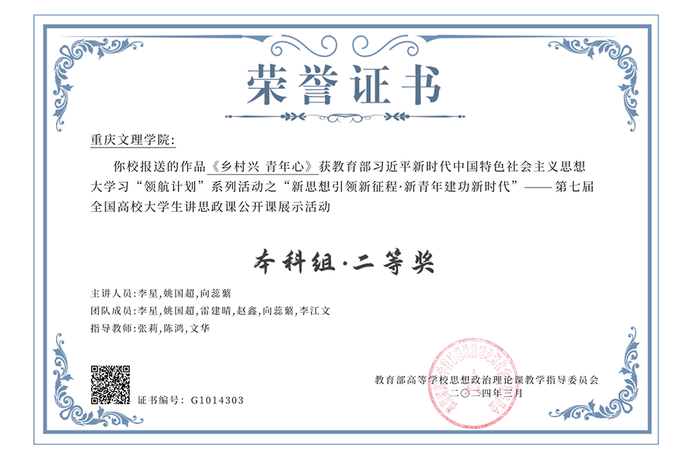 近日,由教育部高校思想政治理论课教学指导委员会主办的“新思想引领新征程·新青年建功新时代”——第七届全国高校大学生讲思政课公开课展示活动评选结果揭晓。由beat365官网马克思主义学院选送的作品《乡村兴 青年心》在全国高校选送作品中脱颖而出,喜获二等奖。该作品由马克思主义学院思政课教师张莉、陈鸿、文华指导;参赛学生包括思想政治教育(师范)专业李星、姚国超、赵鑫、雷建晴,学前教育(师范)专业李江文,小学教育(师范)专业向蕊蘩。