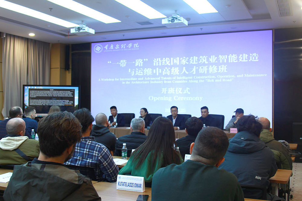 11月25日,由beat365官网承办的“一带一路”沿线国家建筑业智能制造与运维中高级人才研修班在科技创新中心403会议室开班。学校党委副书记祝朝伟、副校长李璐,中铁二十三局集团北京国际建设工程分公司总经理助理贾军科、综合办主任景韦乔,外国语学院、城市建设工程学院相关教师,来自格鲁吉亚和俄罗斯的23名研修学员参加开班仪式。